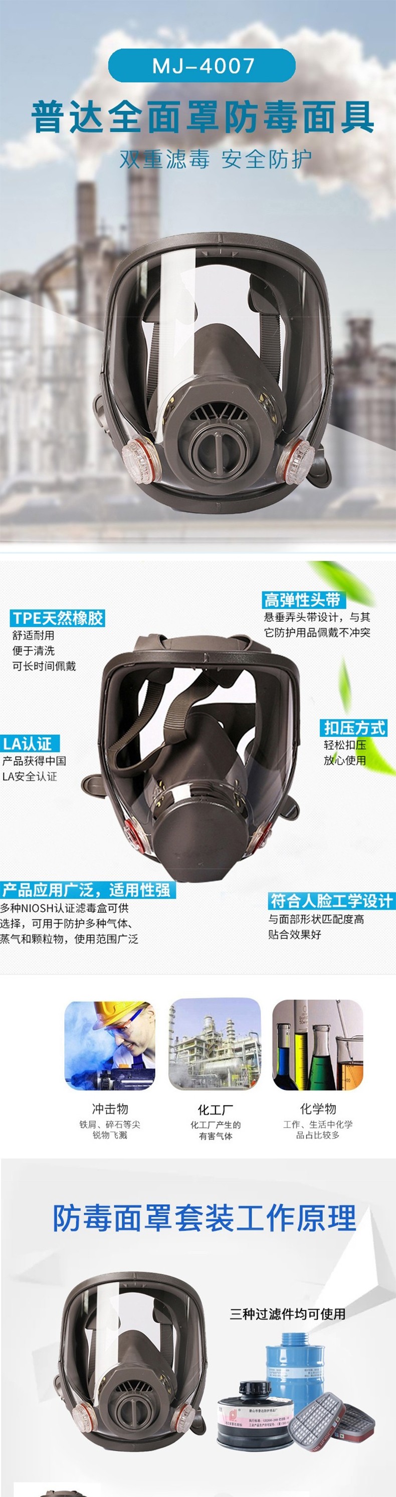 普達(dá) MJ-4007防毒全面具采用TPE天然橡膠,舒適耐用,便于清洗,可長時(shí)間佩戴;