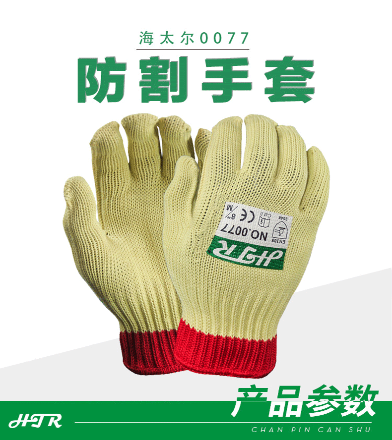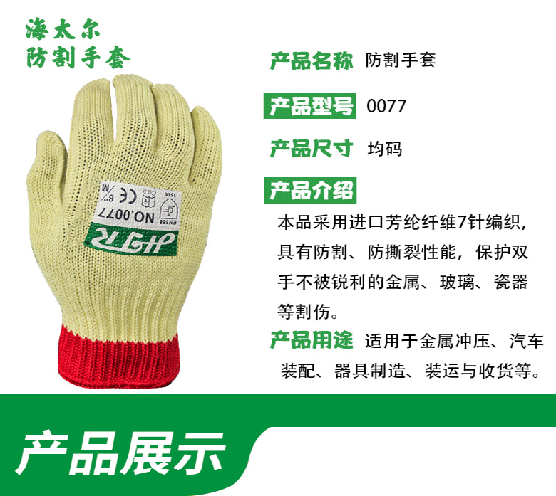 海太爾0077芳綸編織防割手套具有防割、防撕裂性能,保護(hù)雙手不被銳利的金屬、玻璃、瓷器等割傷;