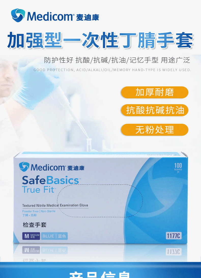 麥迪康1177一次性丁腈手套(加強(qiáng)型)彈力拉伸,緊貼肌膚,符合人體工學(xué)設(shè)計(jì),佩戴時(shí)更加舒適;