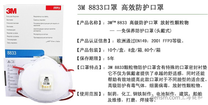 3M8833防毒口罩是高毒和放射性顆粒物防護口罩,高毒和放射性顆粒物防毒口罩。3m8833口罩帶呼氣閥設(shè)計的耳戴式白色防毒口罩,符合中國KN95標(biāo)準,同時獲得歐洲FFP3認證,過濾效率大于95%。
